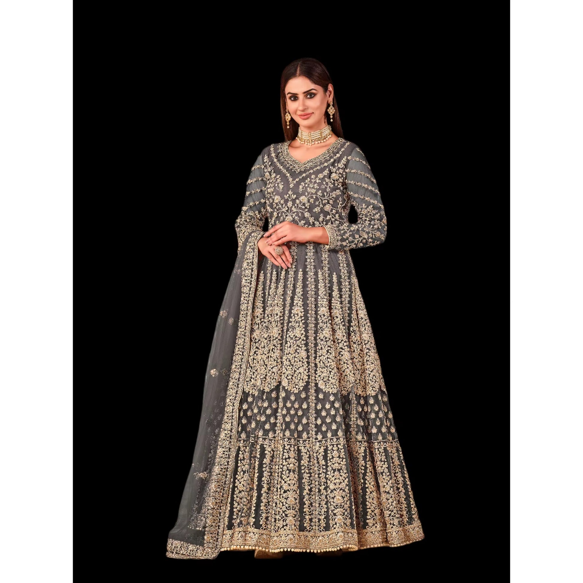 This designer party wear gown is a stunning statement piece, perfect for weddings, receptions, and formal celebrations. Crafted with meticulous attention to detail, it features exquisite heavy thread and sequencework that adds a touch of glamour and luxury.