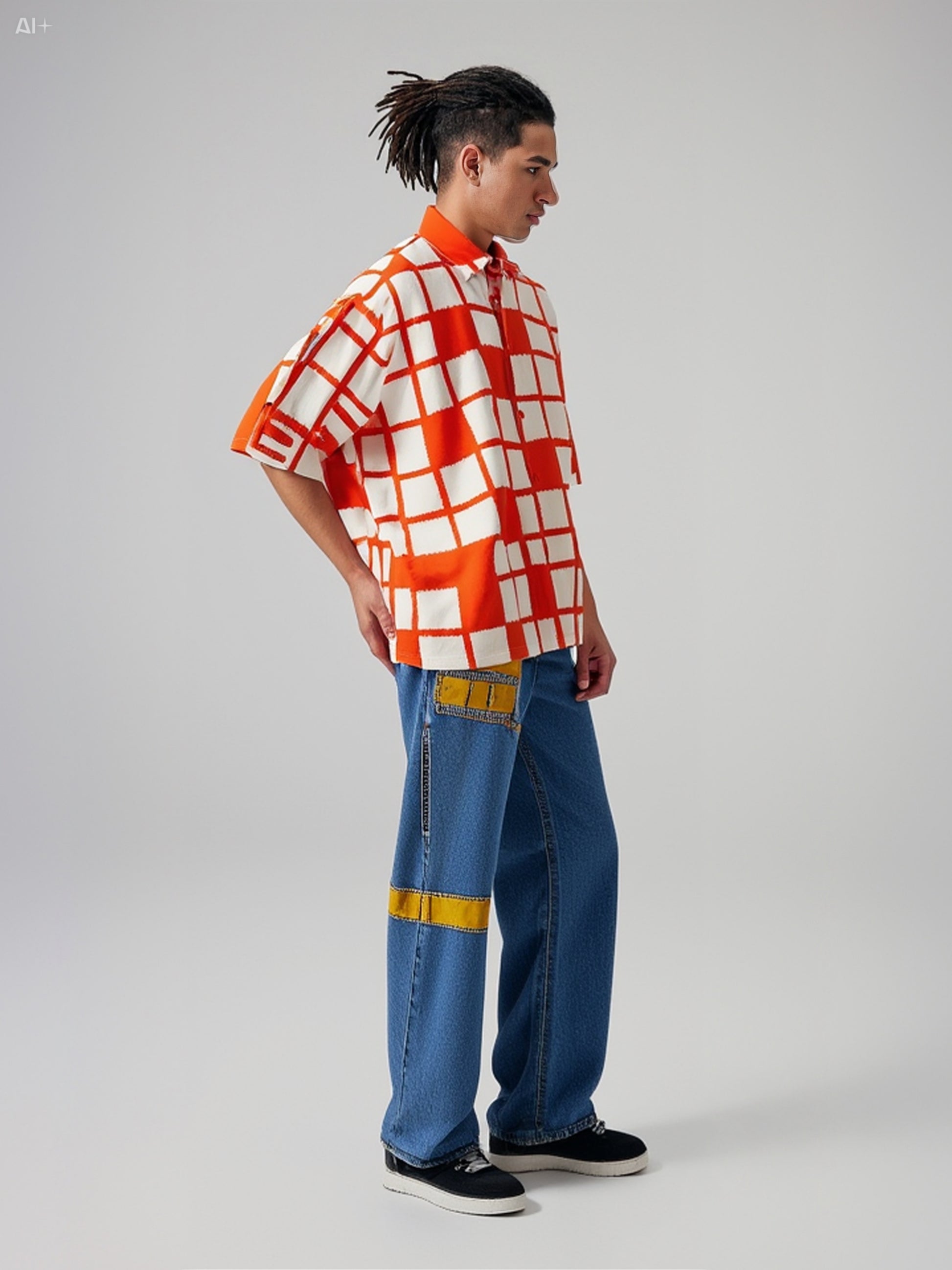 Turn heads with this vibrant oversized check shirt featuring a bold orange and cream grid pattern. The boxy silhouette and contemporary design make this a standout piece for any wardrobe.