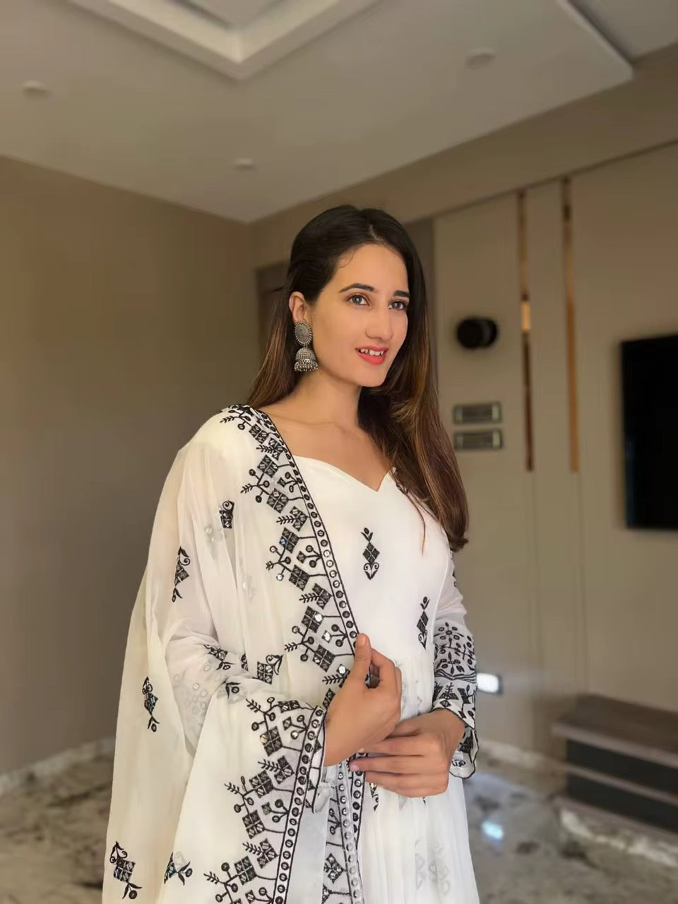 Elevate your ethnic wardrobe with this stylish white salwar kameez crafted from luxurious heavy faux georgette with intricate embroidery and sequin work. Perfect for parties, weddings, graduations, and special occasions across all seasons, this versatile outfit combines traditional elegance with contemporary style.